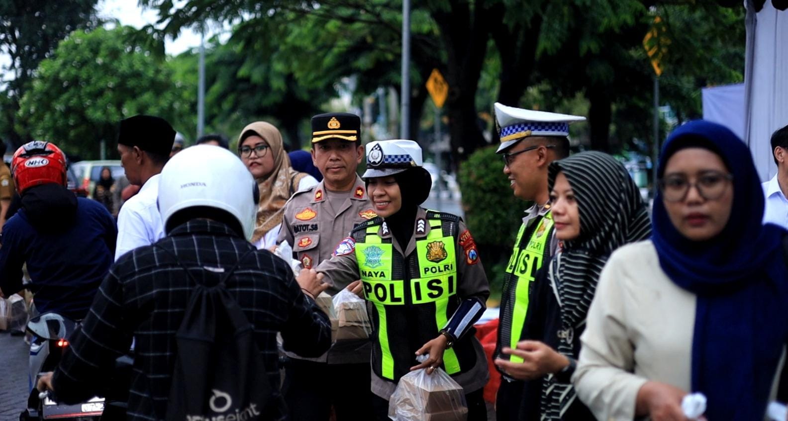 Tak sekadar berbagi makanan berbuka, para petugas juga menyisipkan imbauan tentang pentingnya keselamatan berkendara (safety riding), penggunaan helm berstandar SNI, serta kepatuhan terhadap rambu lalu lintas.