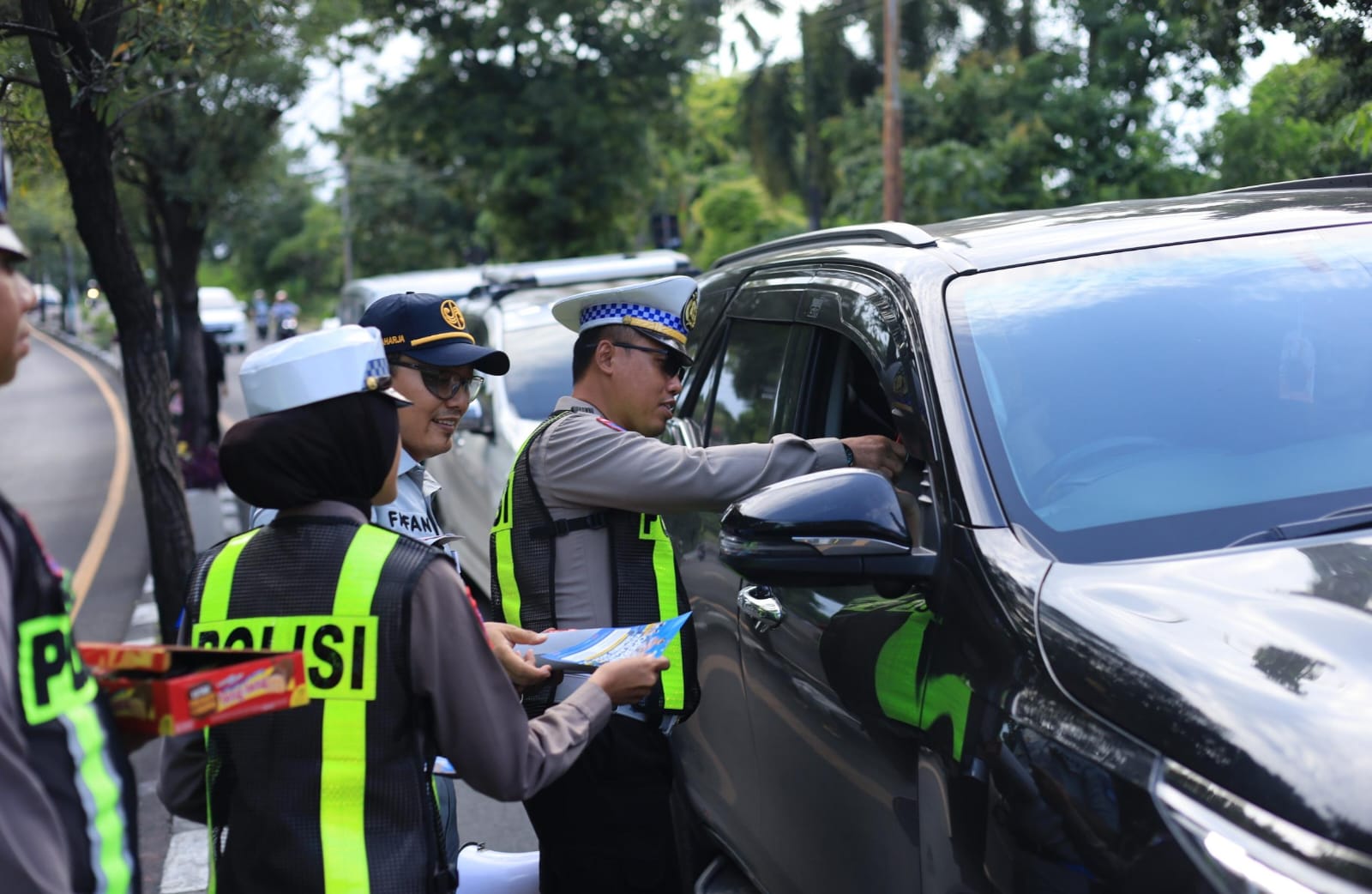 Berbeda dengan razia konvensional, kegiatan kali ini dikemas dengan pendekatan humanis. Petugas tidak hanya memberikan imbauan, tetapi juga membagikan suvenir berupa gantungan kunci dan cokelat kepada pengguna jalan yang tertib berlalu lintas sebagai bentuk apresiasi.